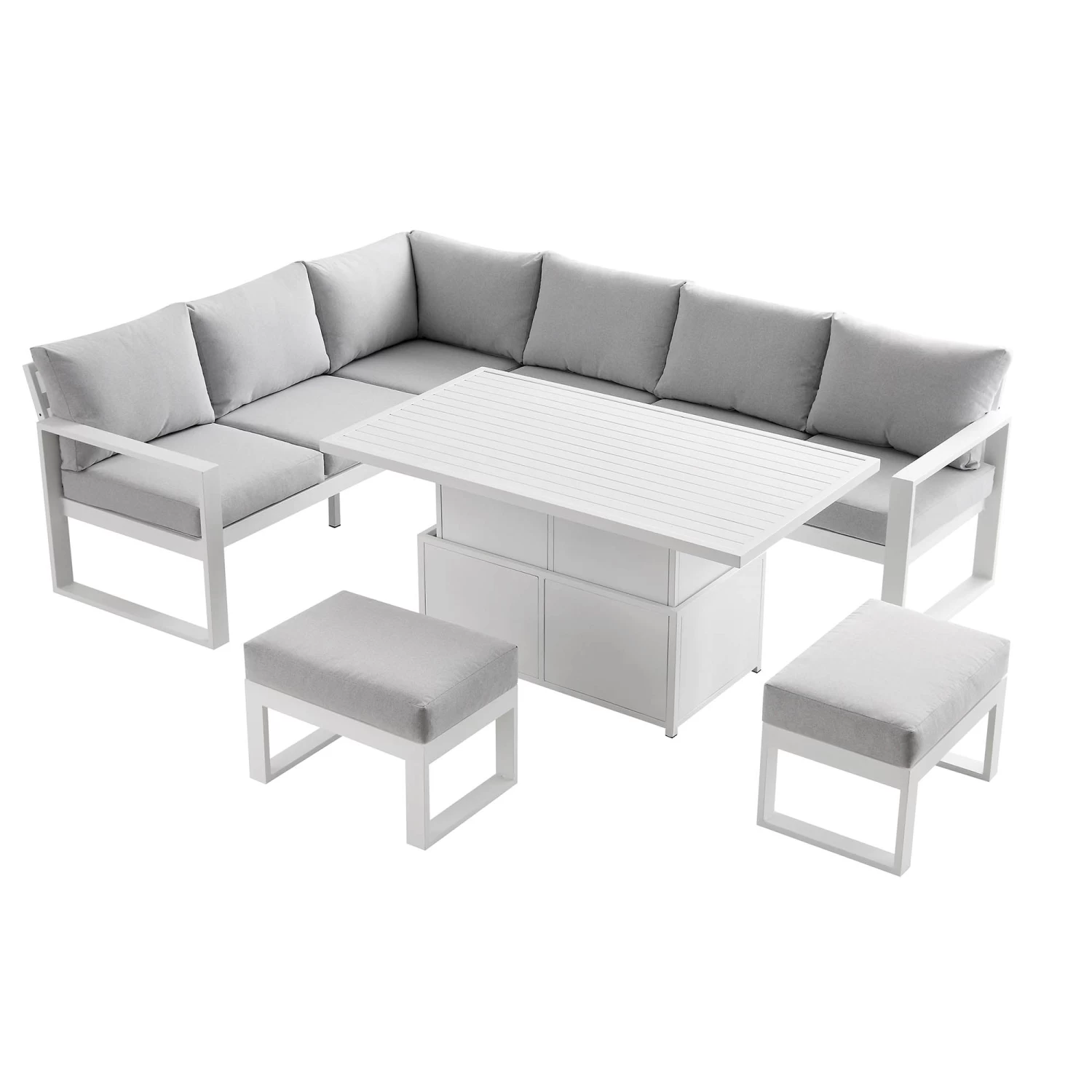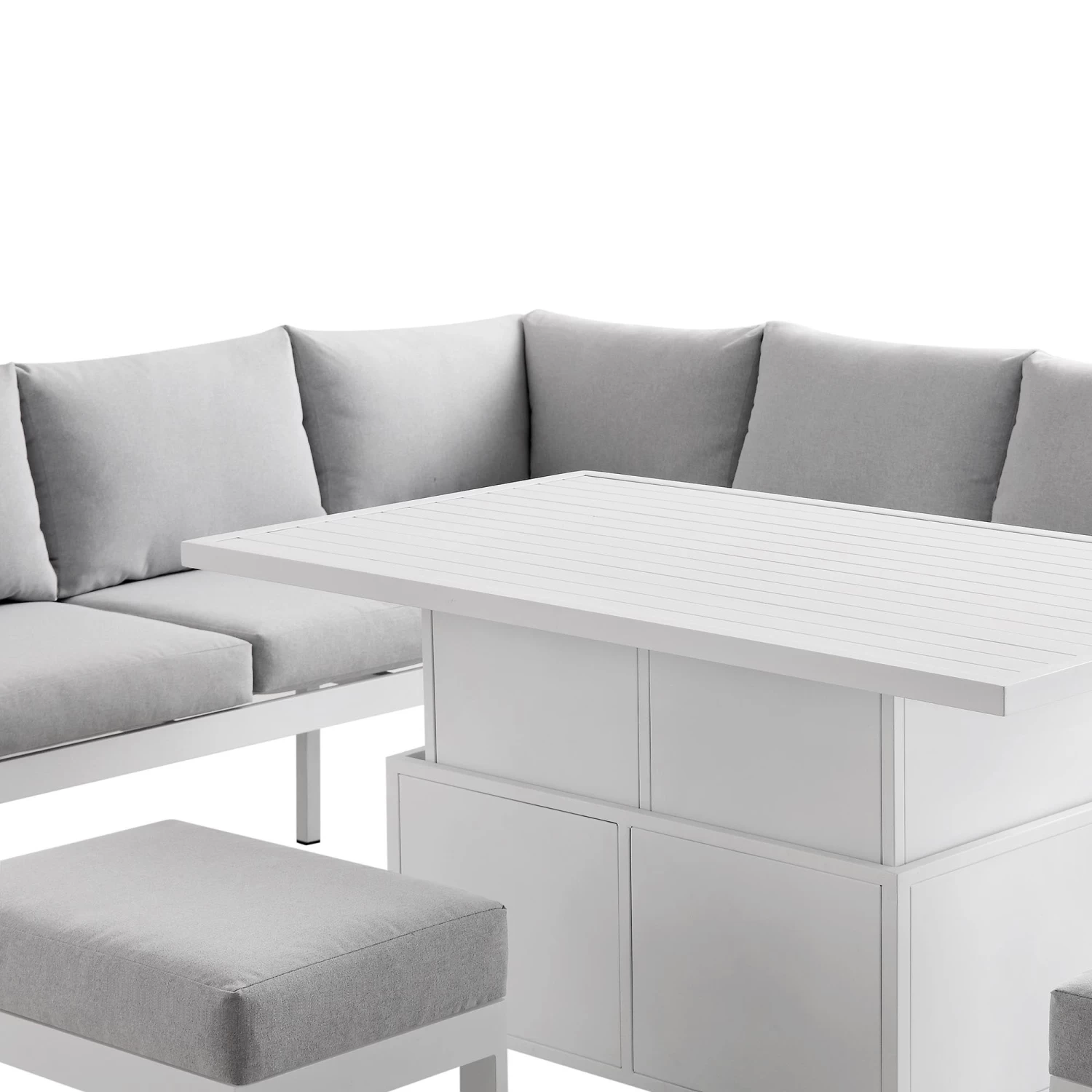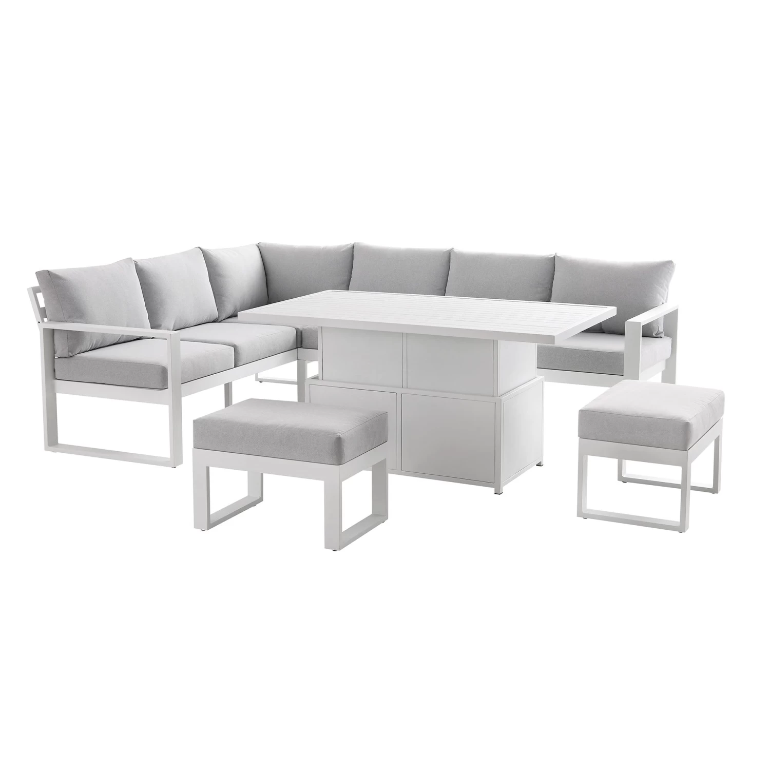 - Comprising of a solid aluminium frame and sumptuous back and seat cushions for added comfort and support, our Albany Large Corner Casual Dining Set is perfect for outdoor gatherings