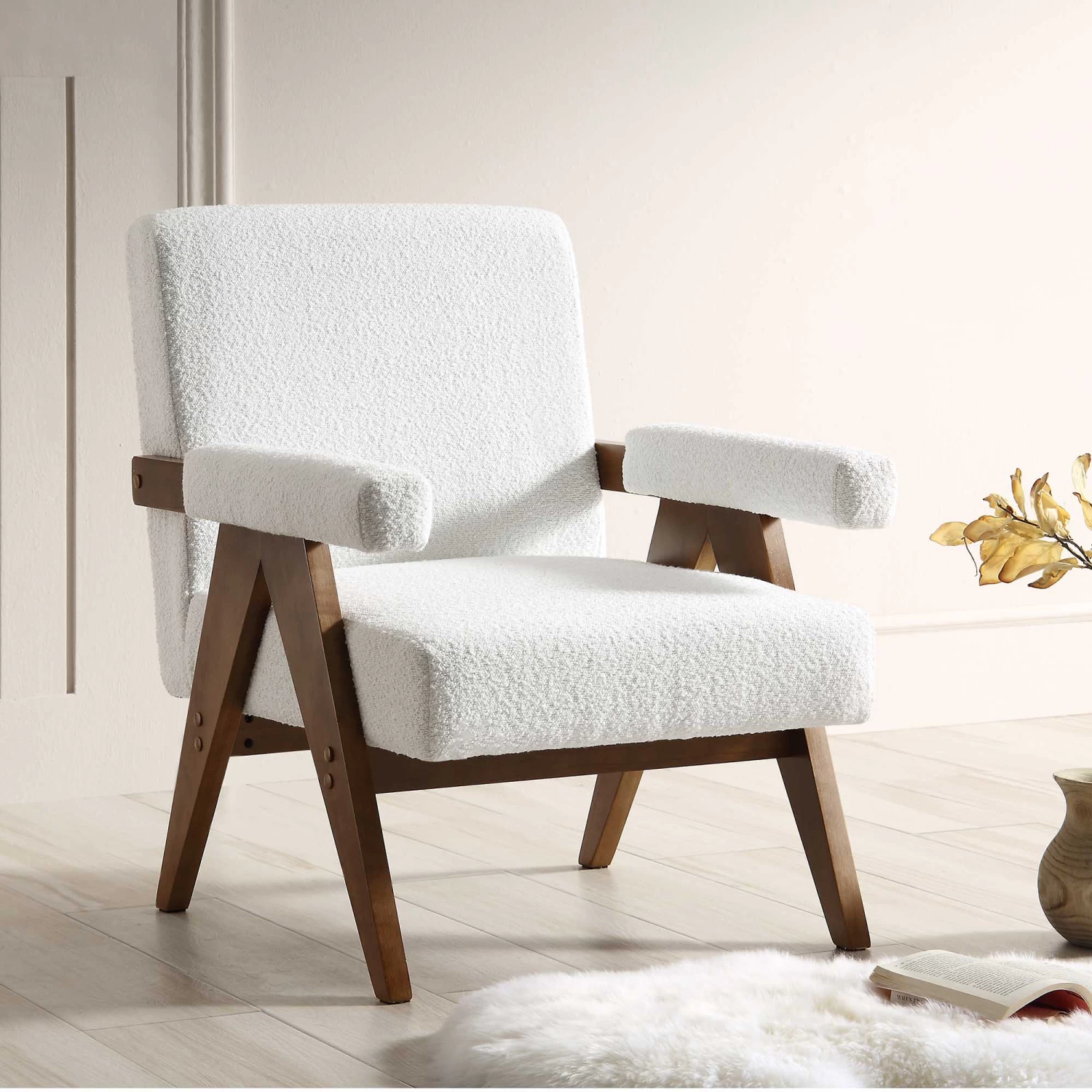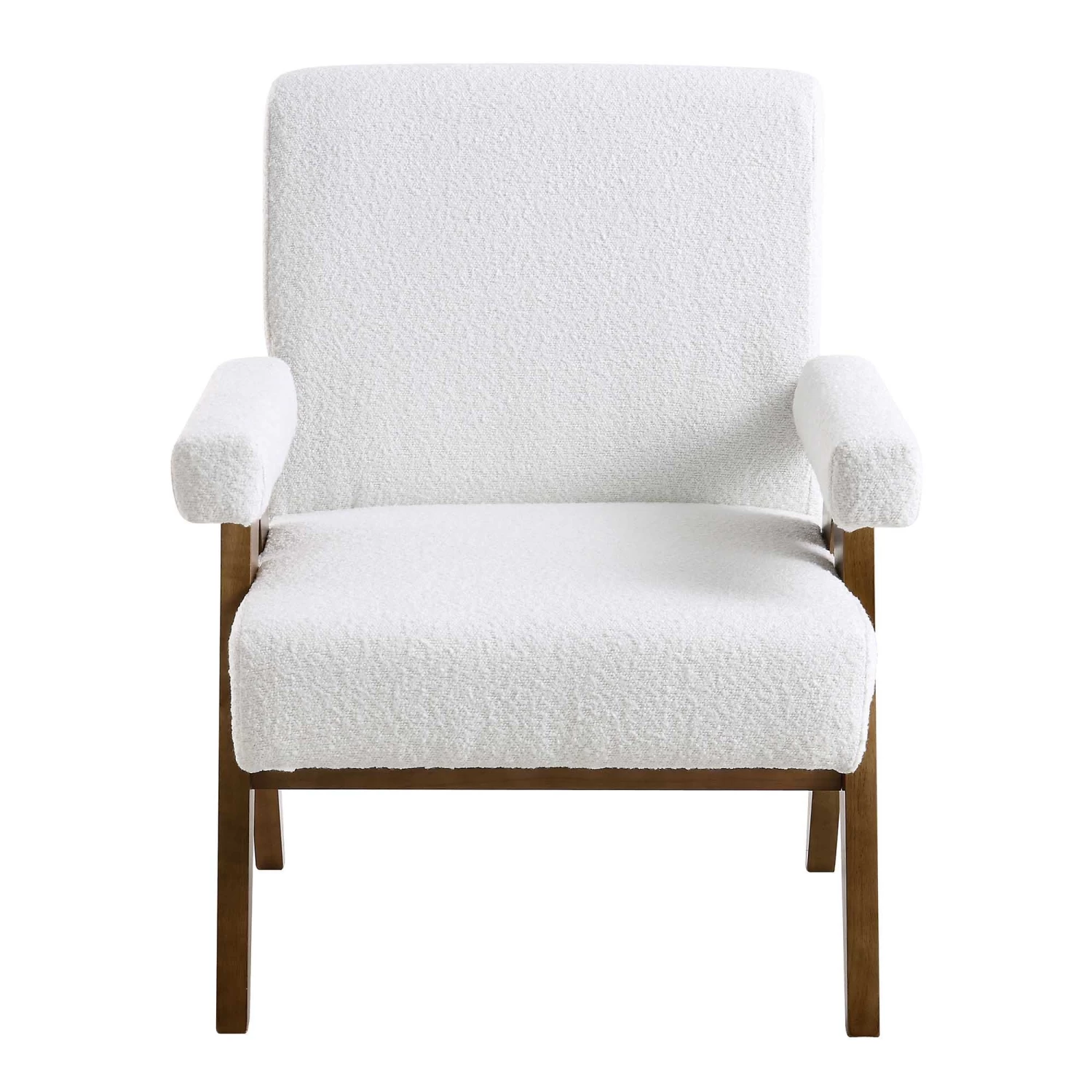 - Well-cushioned in seat, back and arm and upholstered in beautiful textured white boucle fabric, the chair is finished with solid wood legs stained in light walnut shade for a mid-century appeal.