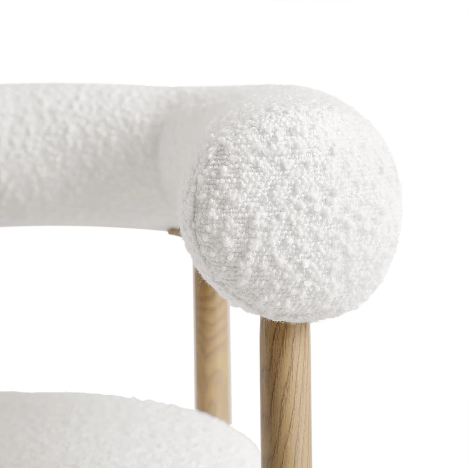 - Well-cushioned seat and luxe boucle upholstery in white colour is paired with natural wood effect legs for a sophisticated look.