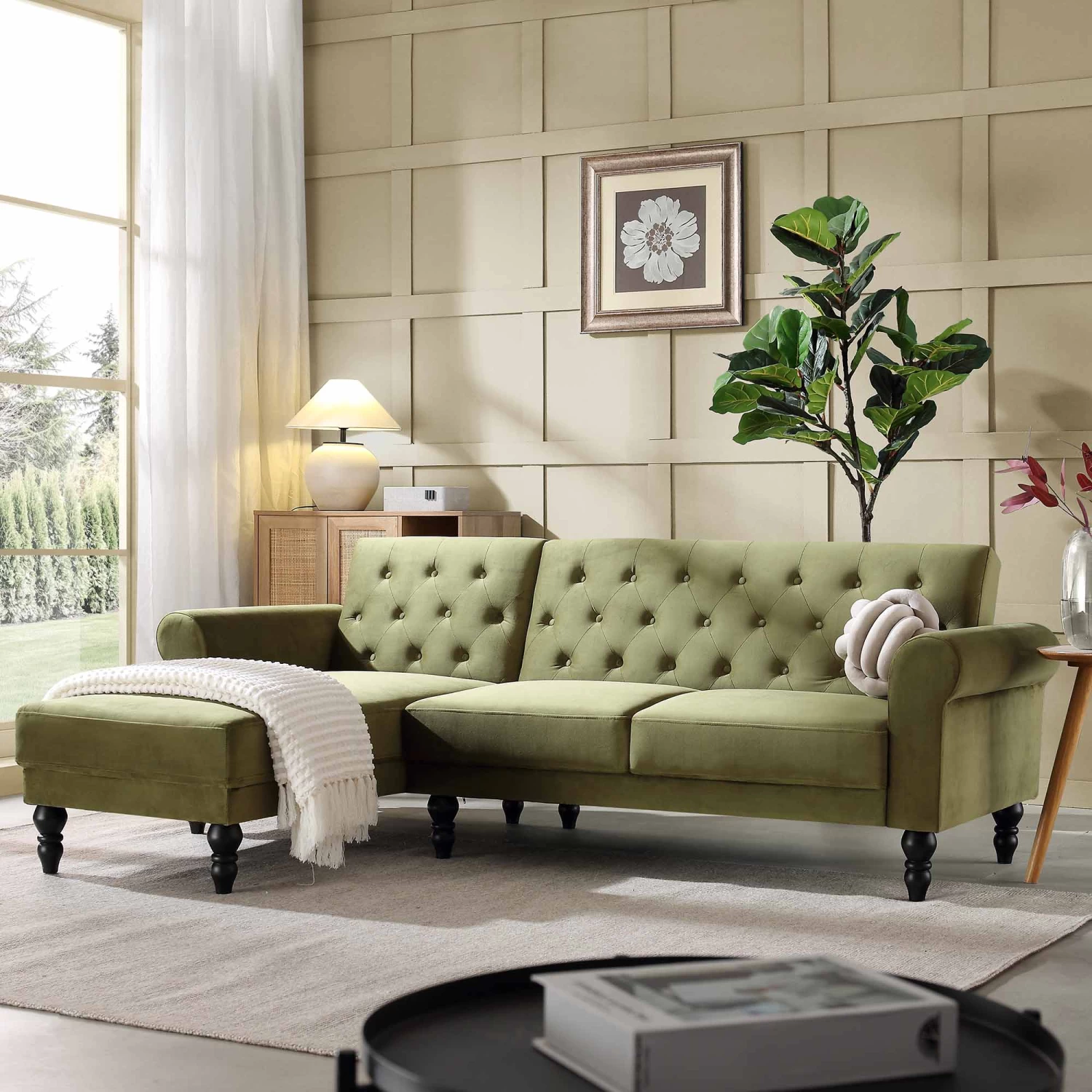 - Complete the look: Pictured with our Hanney Chesterfield Chaise Sofabed is the Frances Woven Rattan Drinks Cabinet in Natural. Combine the two together and bring your space to life!