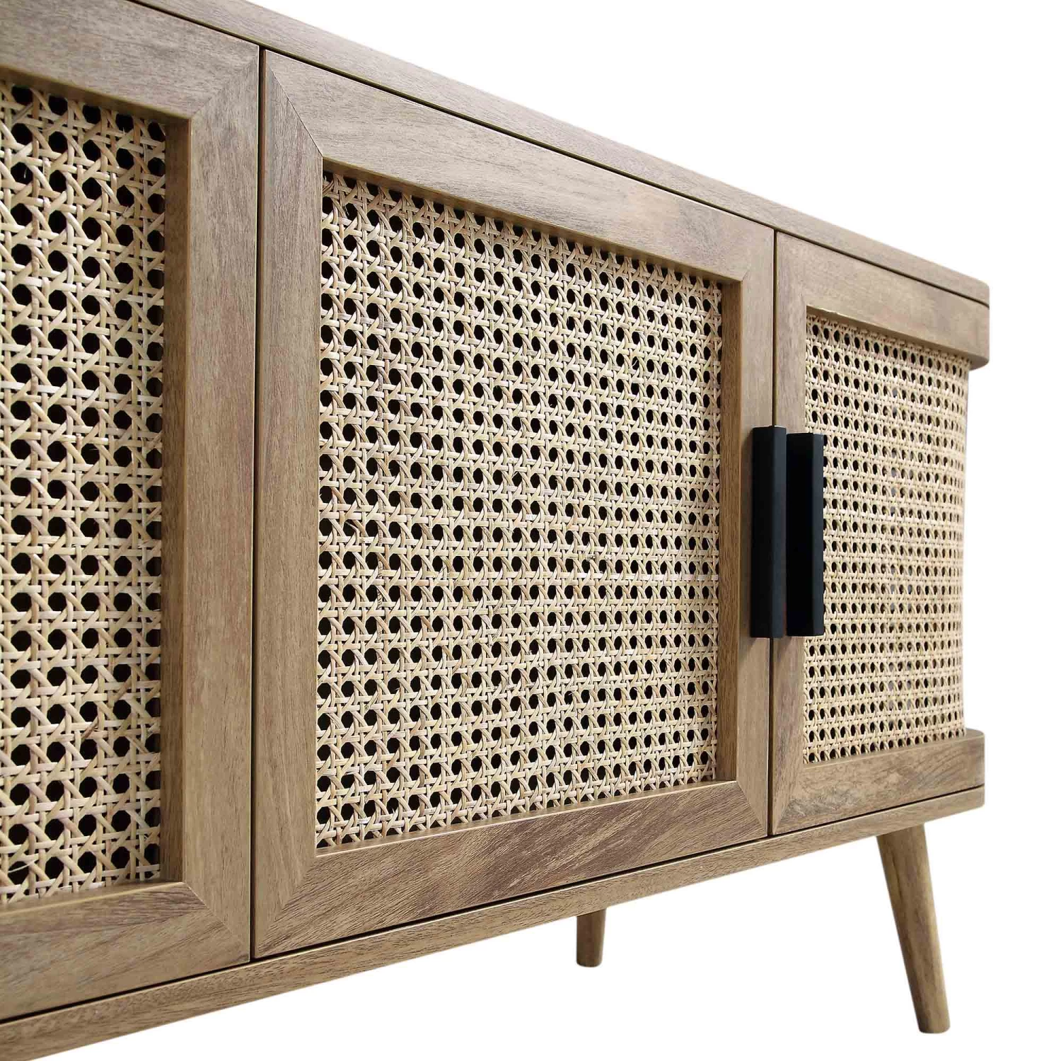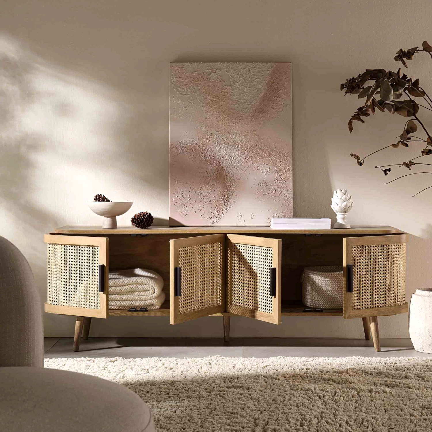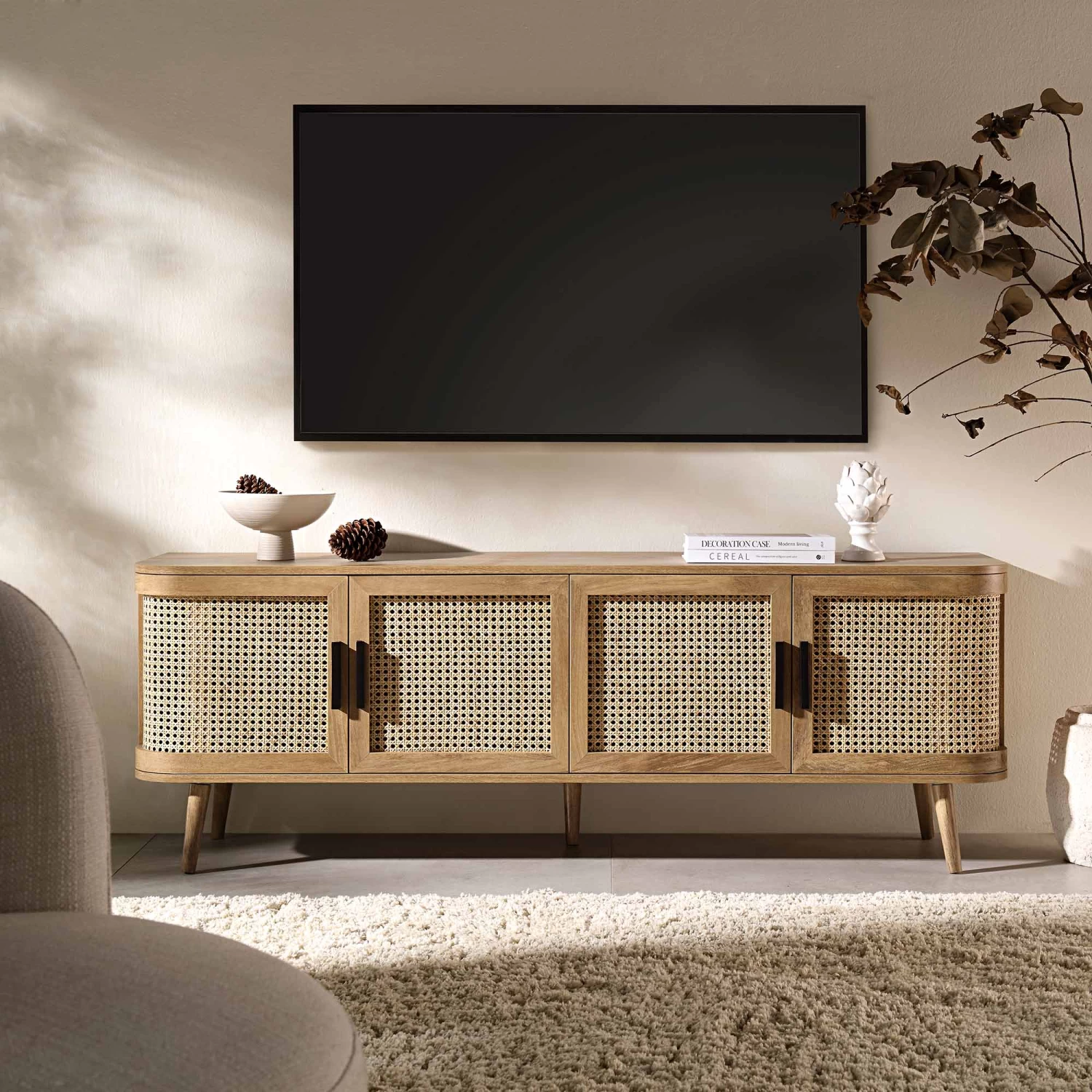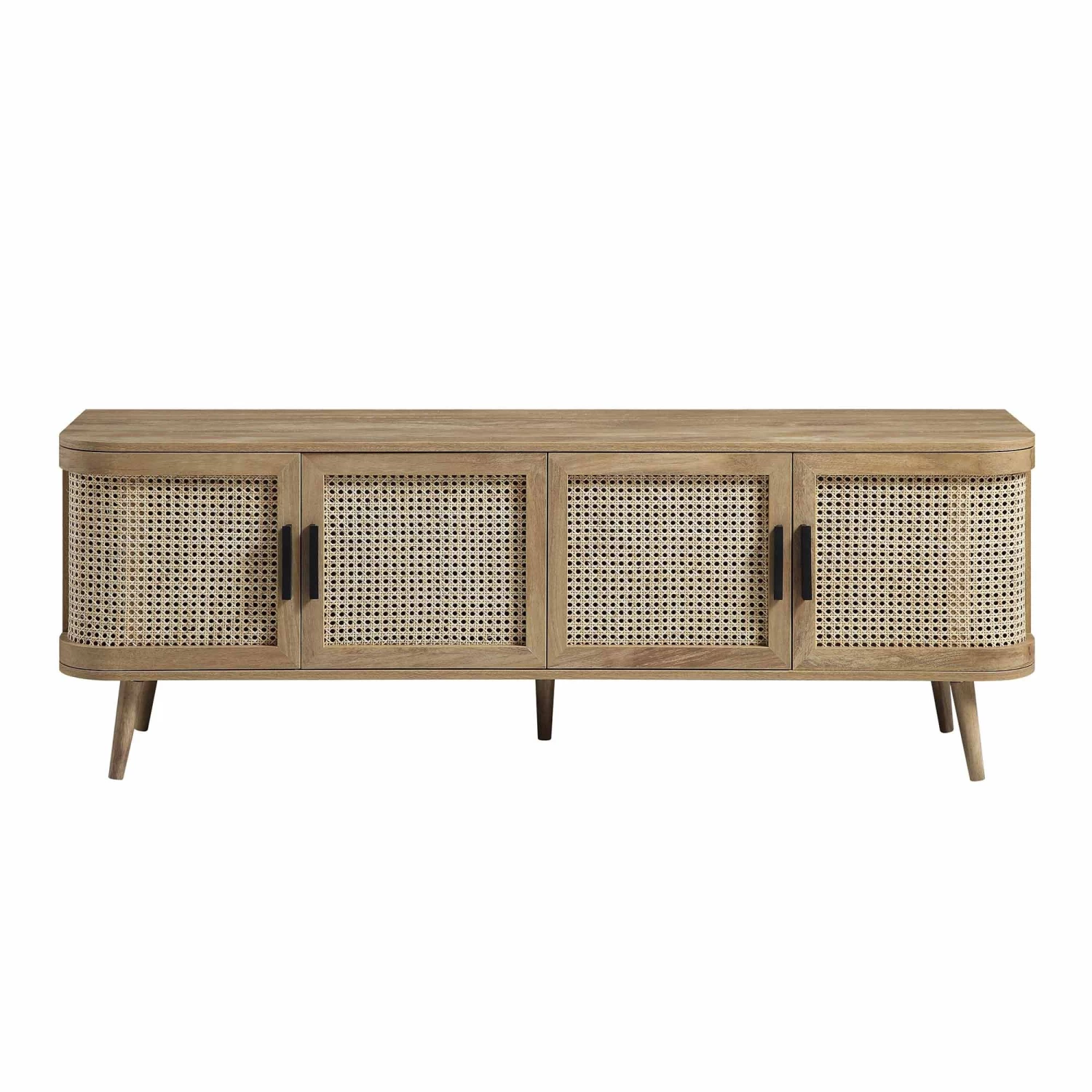 - Bringing natural vibe and lightness to the focal point of the living room, our Izzy TV unit features rounded edges with gently curved rattan panels.