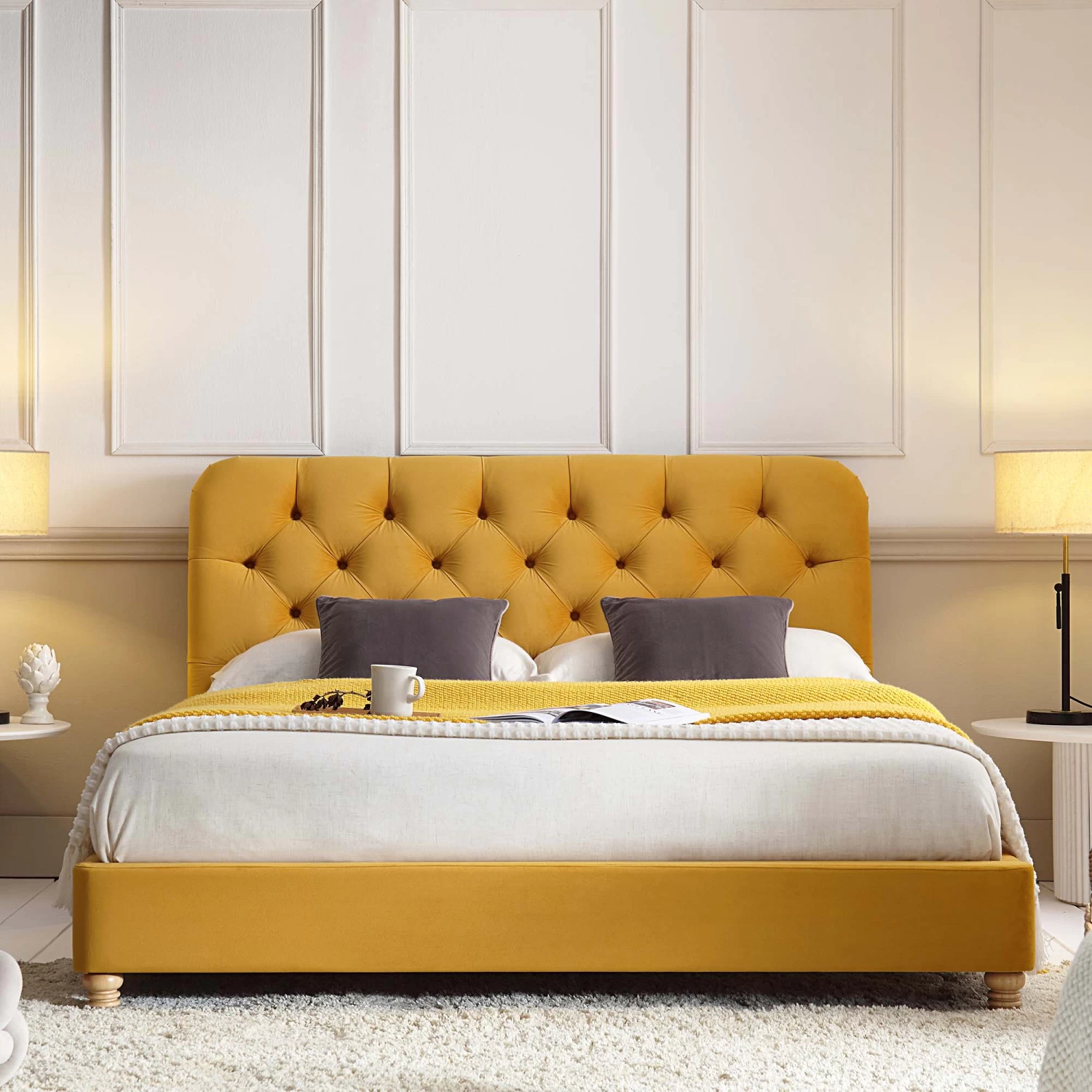 - The bed is upholstered with sumptuous velvet touch fabric in rich yellow fabric.