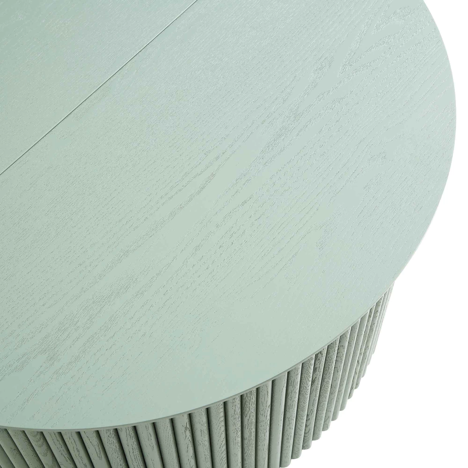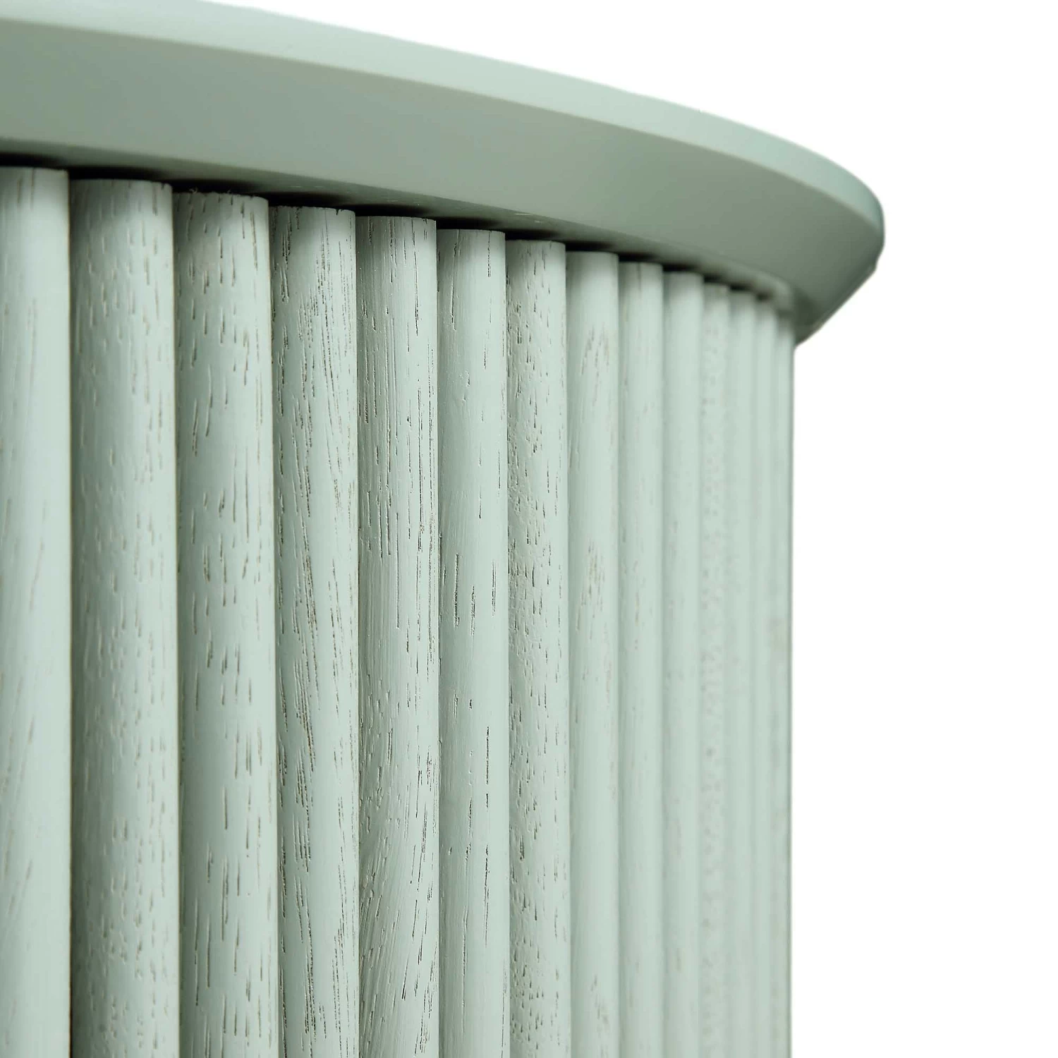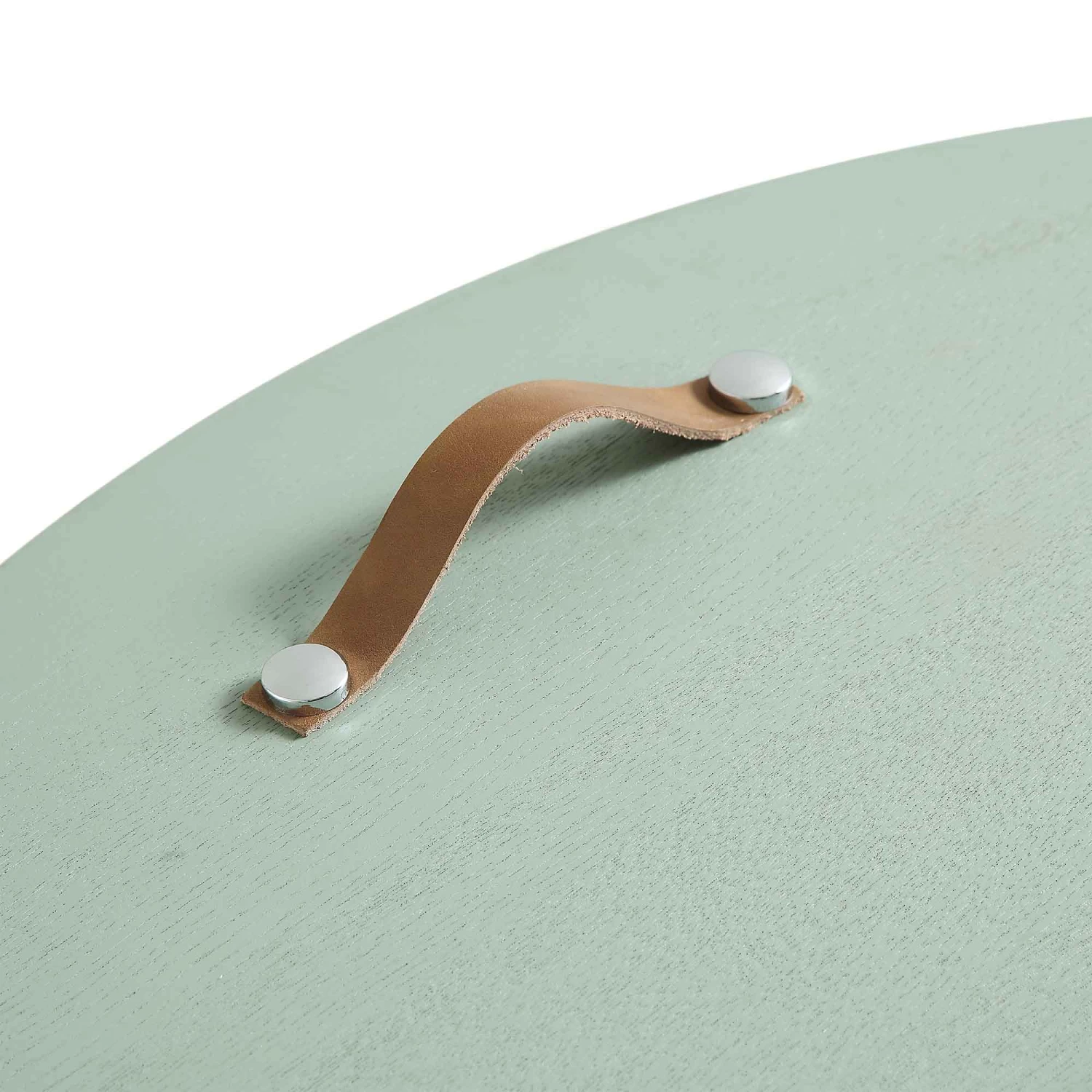 - Crafted from solid and and oak veneer and finished with sage green paint, each table has its unique natural grains and knots.