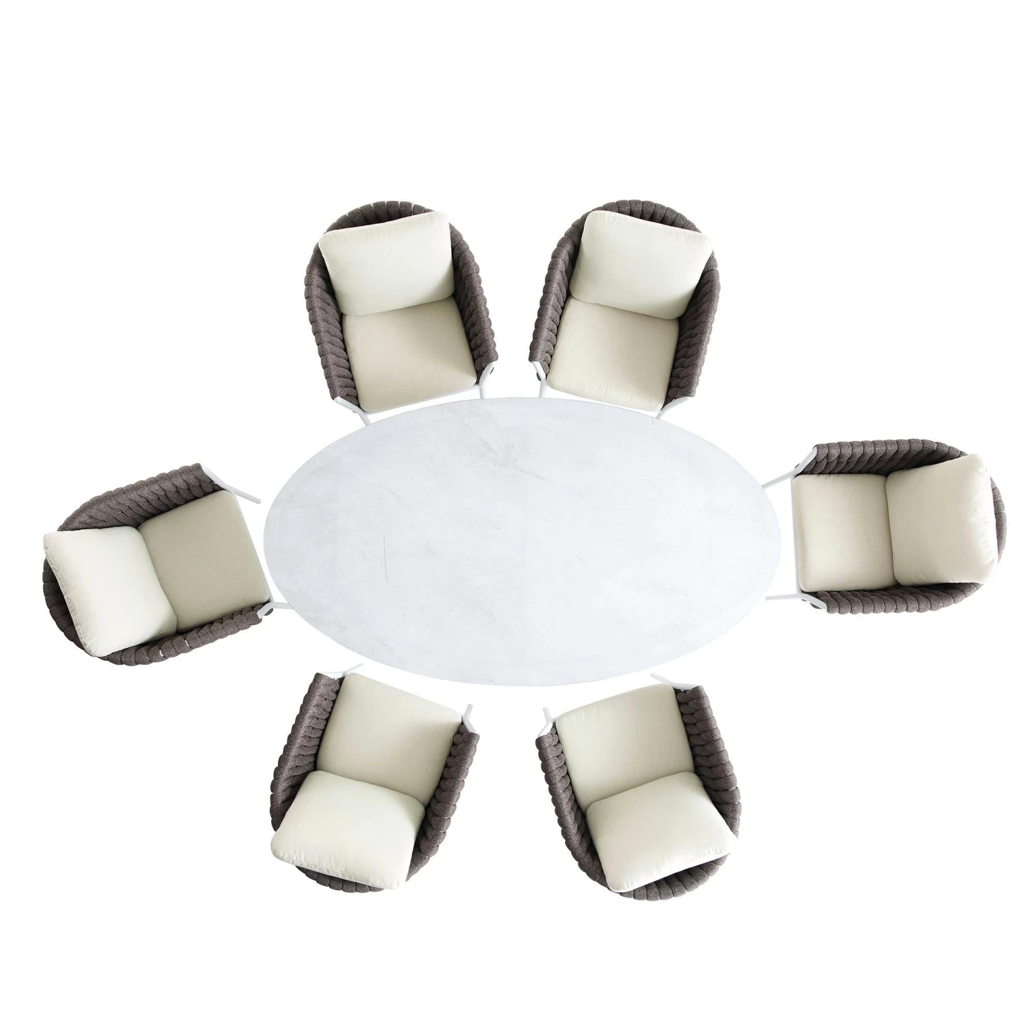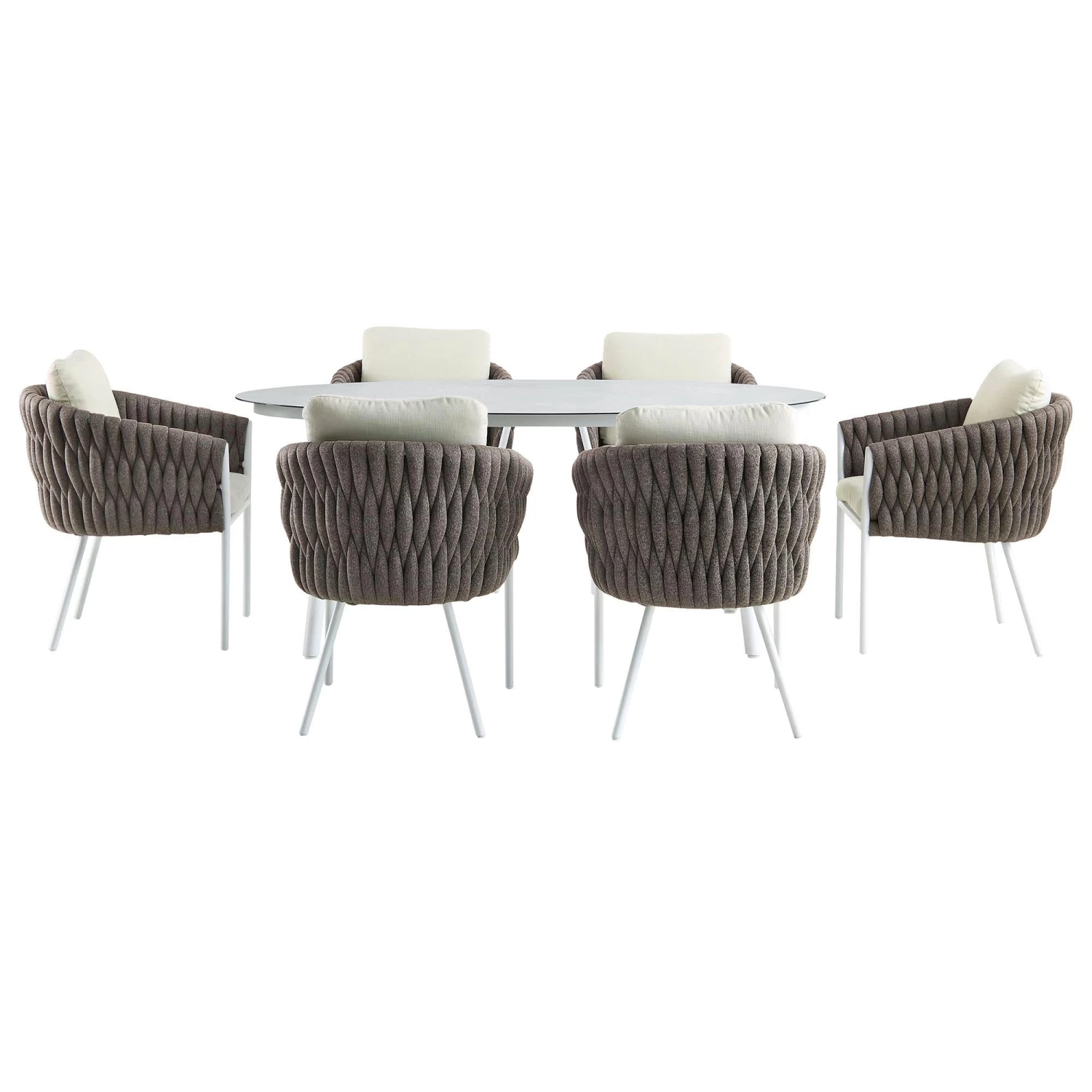 - The white aluminium frame is then entwined with dark taupe coloured thick, handwoven rope, together with a beautiful marble effect ceramic dining table, allowing you to make quite the statement in your outdoor space