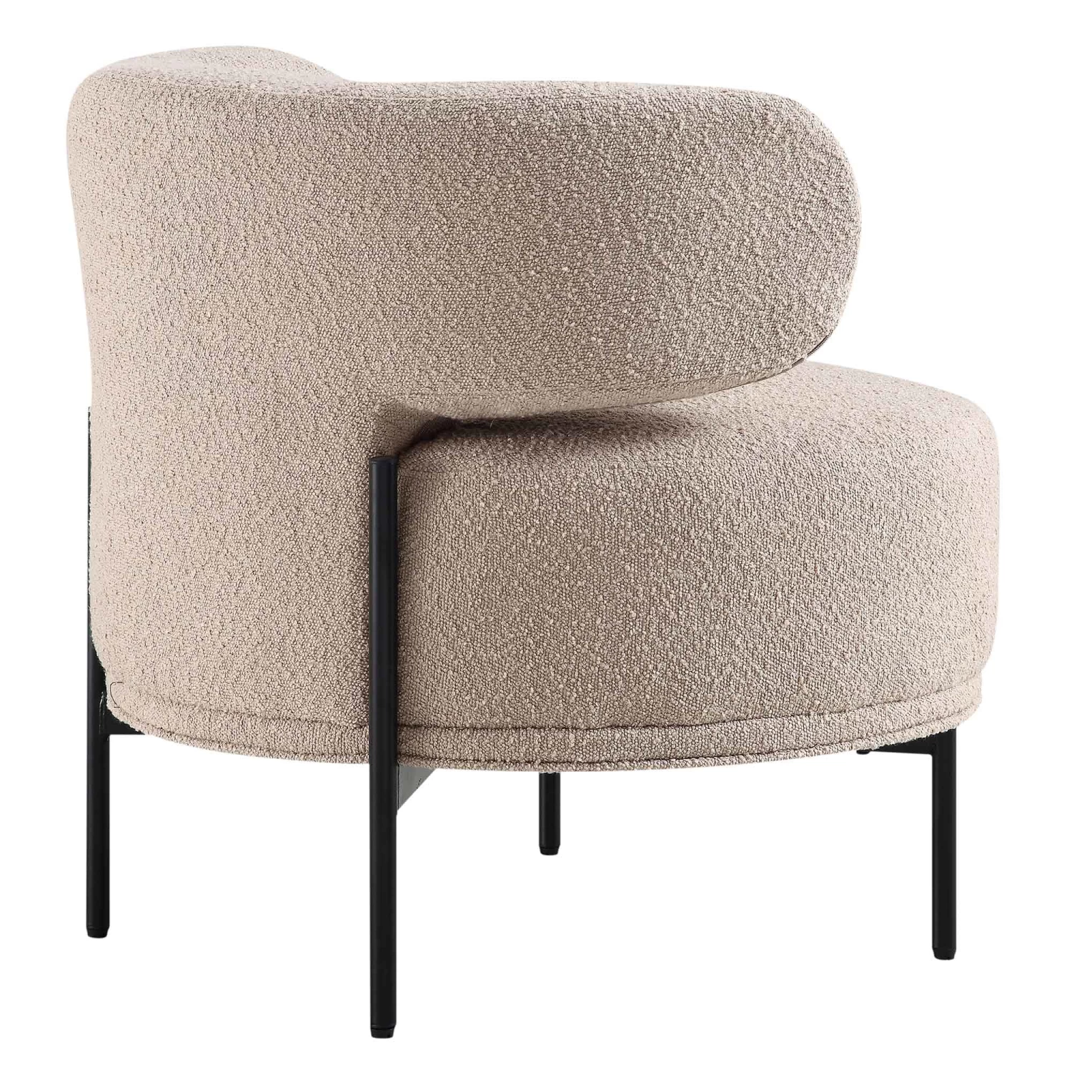 - Chunky seat is well cushioned and upholstered with textured boucle fabric in sand colour, paired with slim metal legs finished in matte black for a sophisticated look.